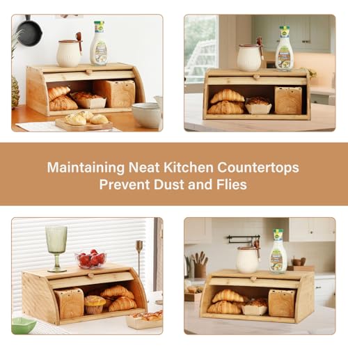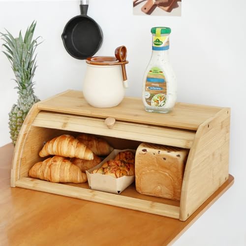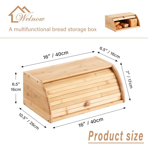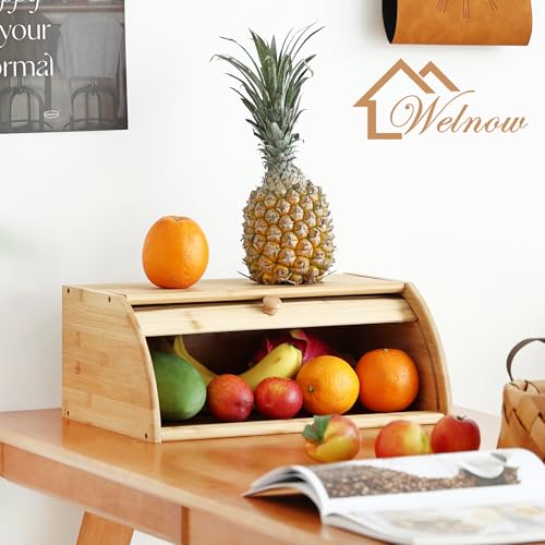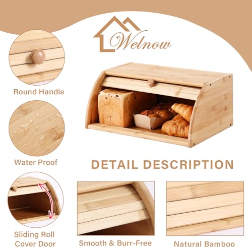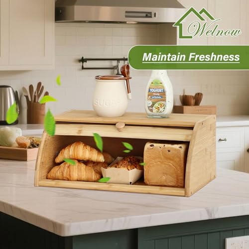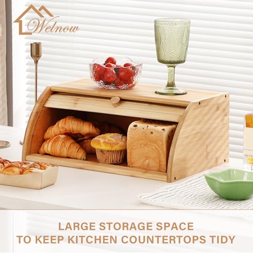 Welnow - ويلنو صندوق خبز من الخيزران لطاولة المطبخ، صندوق تخزين خبز خشبي كبير مع غطاء علوي ملفوف، حامل خبز من الخيزران الطبيعي للرغيف والمعجنات والخبز