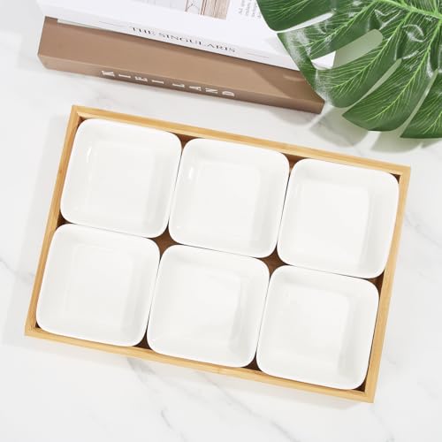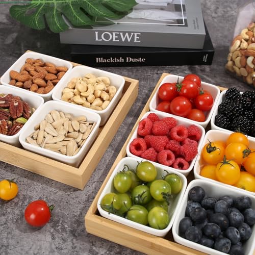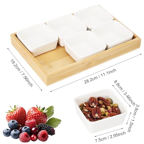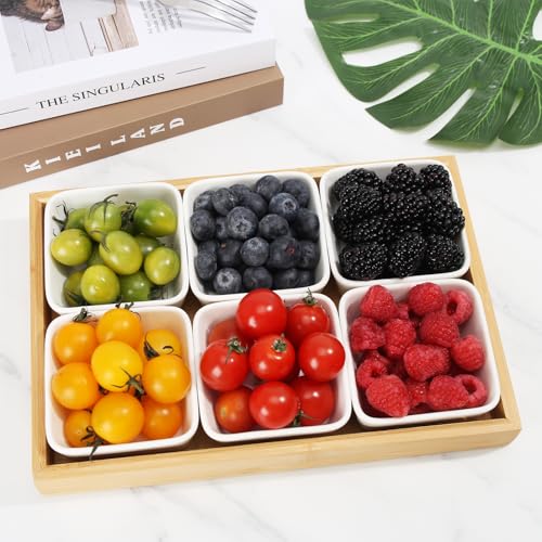 WENMAQIN - اوعية طعام من السيراميك مع صينية من الخيزران من وينماكين، اطباق تقديم مقسمة للاستضافة والحفلات، اطباق تقديم قابلة للازالة للرقائق والغموس والفواكه والخضروات والحلوى والوجبات الخفيفة، ديكور المطبخ (6)