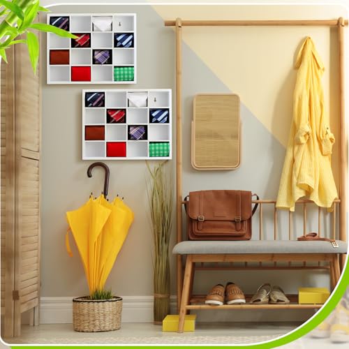 Wesiti - ويسيتي صندوق منظم لربطات العنق يثبت على الحائط مع 16 مساحة تخزين وحامل حزام من الخيزران للرجال والاوشحة وربطات العنق وخزانة المنزل (لون ابيض، قطعتان)