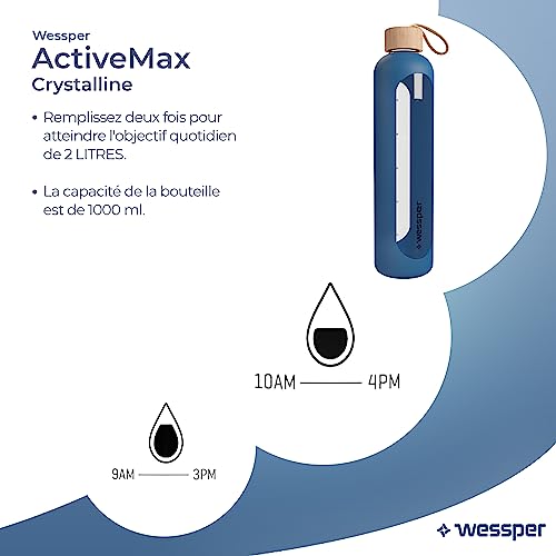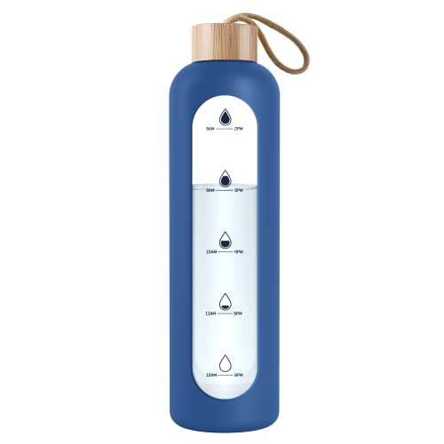 Wessper - زجاجة مياه زجاجية مع غطاء سيليكون من ويسبر، زجاجة مياه مع علامات للوقت، زجاجة مياه شفافة مصنوعة من زجاج البوروسيليكات لمراقبة امتصاص الماء اليومي، 1 لتر، لون أزرق