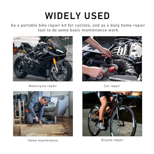 - 【وظيفة ممتازة】: تتميز مجموعة أدوات إصلاح الدراجات هذه بوظيفة ممتازة، مما يساعدك على الحفاظ على تشغيل الدراجة بشكل طبيعي. كمجموعة إصلاح، يمكنها حل معظم مشاكل الدراجات أو الدراجات النارية بشكل فعال، بما في ذلك شد أو فك البراغي وتفكيك واستبدال الأجزاء.