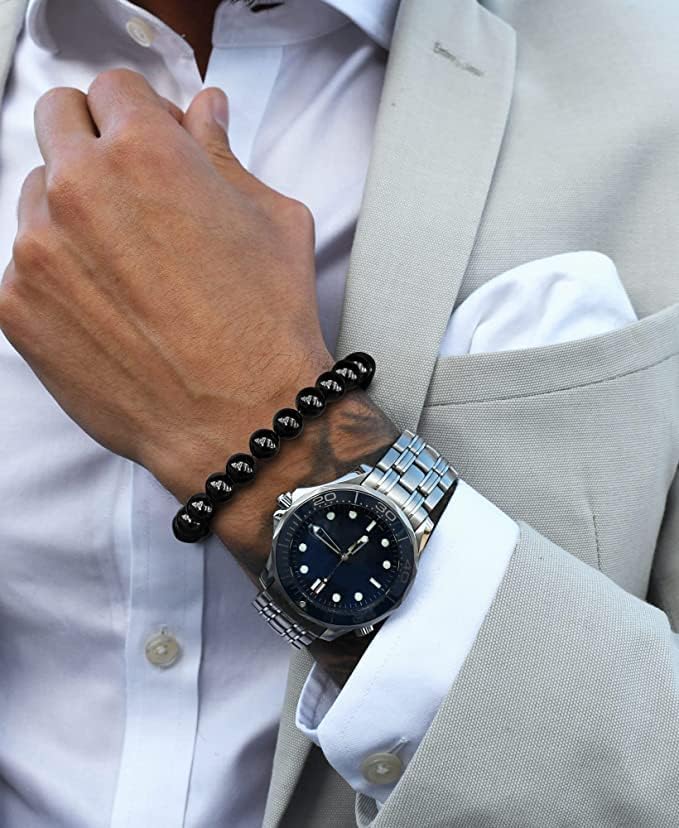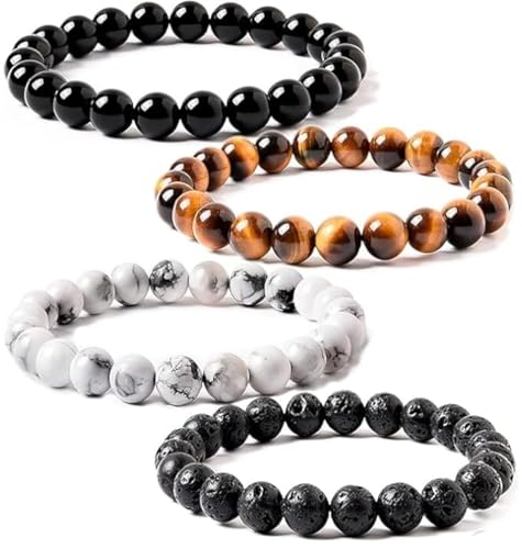 WFJ - مجموعة اساور حماية ثلاثية من الزجاج البركاني الاسود - سوار حجر عين النمر الطبيعي للرجال والنساء من الاحجار الكريمة (10 ملم)