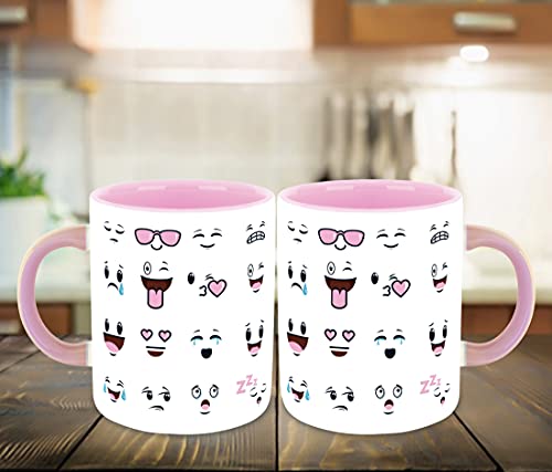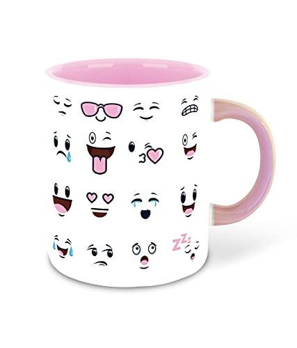 WHATS YOUR KICK - مج قهوة سيراميك بلون وردي من الداخل ومطبوع عليه رموز تعبيرية لطيفة مع قاعدة أكواب من واتس يور كيك®، بالوجوه التعبيرية اللطيفة مناسب للهدايا ولأعياد الميلاد، تصميم 5