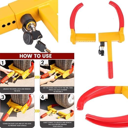 - ✅ قفل مشبك عجلة السيارة او المقطورة مصنوع من ألواح الصلب السميكة القوية والمتينة ويطرد المخاطر المحتملة لسرقة الإطارات والسيارات. سوف يمنع حركة العجلة تمامًا من الدوران أو الدوران.