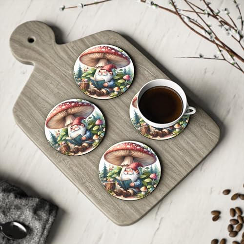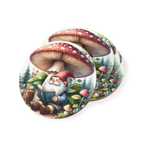Generic - قواعد أكواب خشبية مزخرفة بتصميم قزم مرح مع كتاب وفطر عش الغراب، حوامل أكواب دائرية لديكور المنزل أو المكتب مقاومة للحرارة ومتينة، مجموعة من 4 قطع