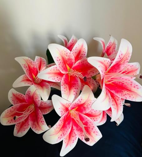 Generic - باقة زهور الزنبق الأبيض والوردي المنقط، زهور صناعية مع أوراق خضراء، تصميم كلاسيكي للديكور المنزلي