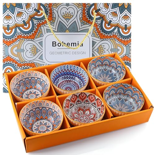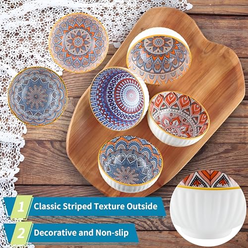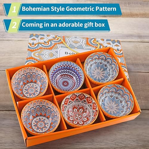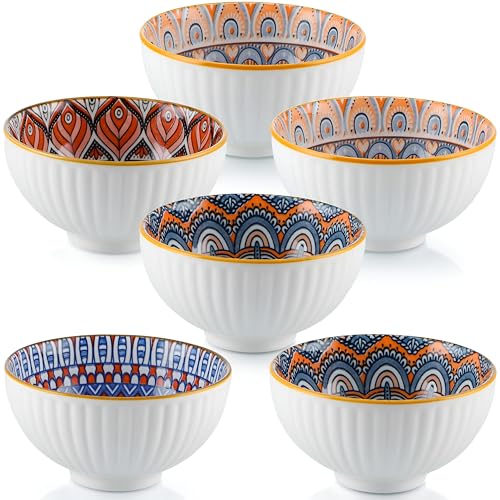 - يتميز كل وعاء من الأوعية الخزفية الستة بنمط هندسي بوهيمي داخلي فريد مع زخارف مستوحاة من ماندالا بألوان برتقالية دافئة وأزرق وترابي، مما يخلق تباينًا فنيًا نابضًا بالحياة مع السطح الخارجي الأبيض المضلع الأنيق والحافة الذهبية، مما يجعل كل قطعة عملًا فنيًا مستقلًا للوجبات اليومية أو المناسبات الخاصة.