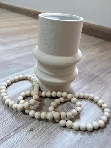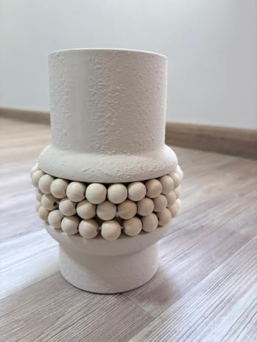 Generic - فازة سيراميك مع إكليل خرز من الخشب الطبيعي، حامل زهور مزخرف عصري، ديكور منزلي بنمط المنزل الريفي مع لمسة نهائية مزخرفة، أبيض