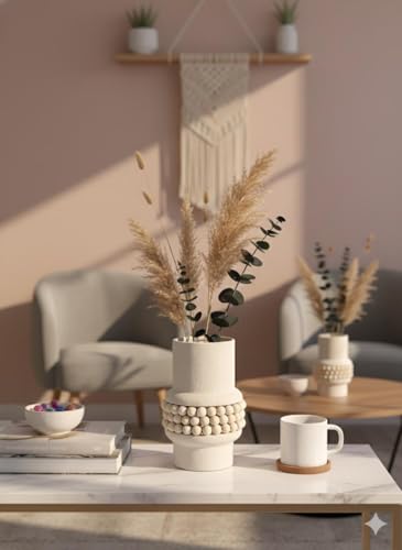 - مزايا التصميم: فازة سيراميك بيضاء مزخرفة مع شريط فريد من نوعه من الخرز مصنوع من كرات خشبية طبيعية، مثالية لديكور المنزل الريفي الحديث.