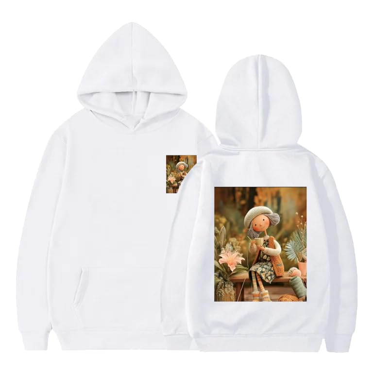 Generic - هودي من مزيج القطن الابيض مع طباعة دمية مزخرفة، سويت شيرت بلوفر كاجوال، كم طويل، مقاس (L)