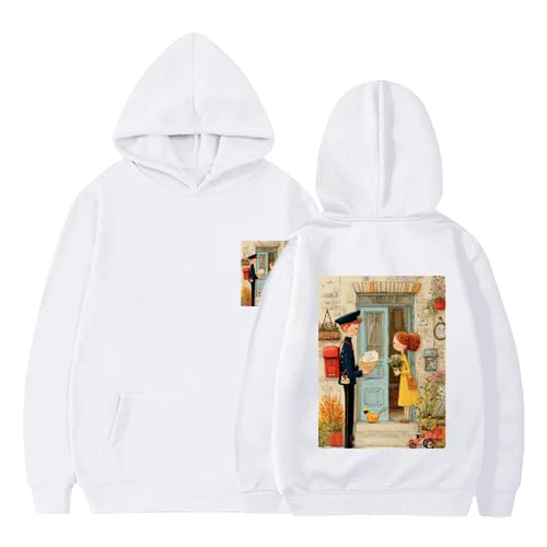 Generic - هودي قطن ابيض مع طباعة مشهد الخريف العتيق، كم طويل مقاس (S)