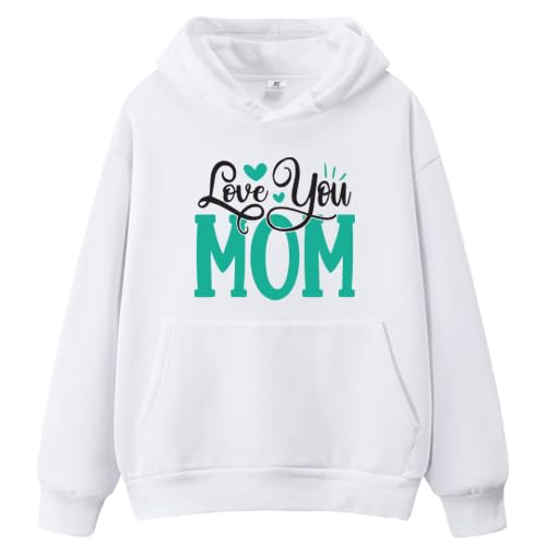 Generic - سويت شيرت بغطاء للرأس بلون أبيض مطبوع عليه عبارة "Love You Mom" وجيب متصل وأكمام طويلة (مقاس ميديوم M)