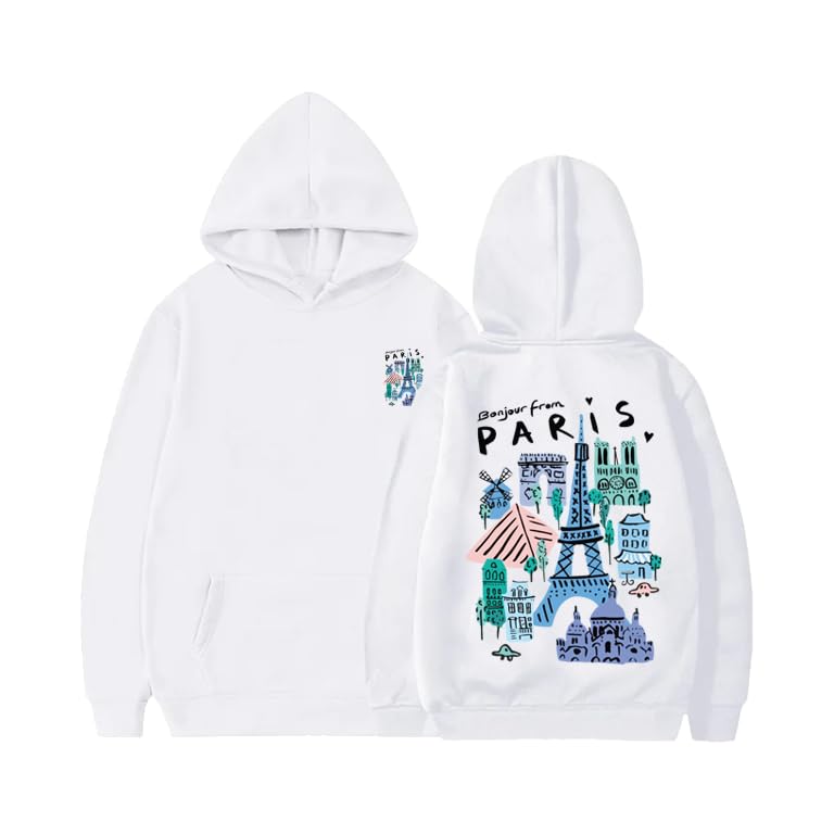 Generic - هودي ابيض بطباعة معالم باريس، بونجور من باريس موضوع، جيب امامي، مقاس (S)
