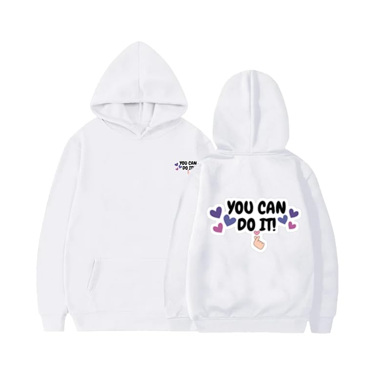 Generic - سويت شيرت بغطاء رأس ابيض مطبوع عليه You Can Do It تحفيزية، تصميم قلوب ارجوانية، مقاس رسومات امامية وخلفية (9-12 سنة)