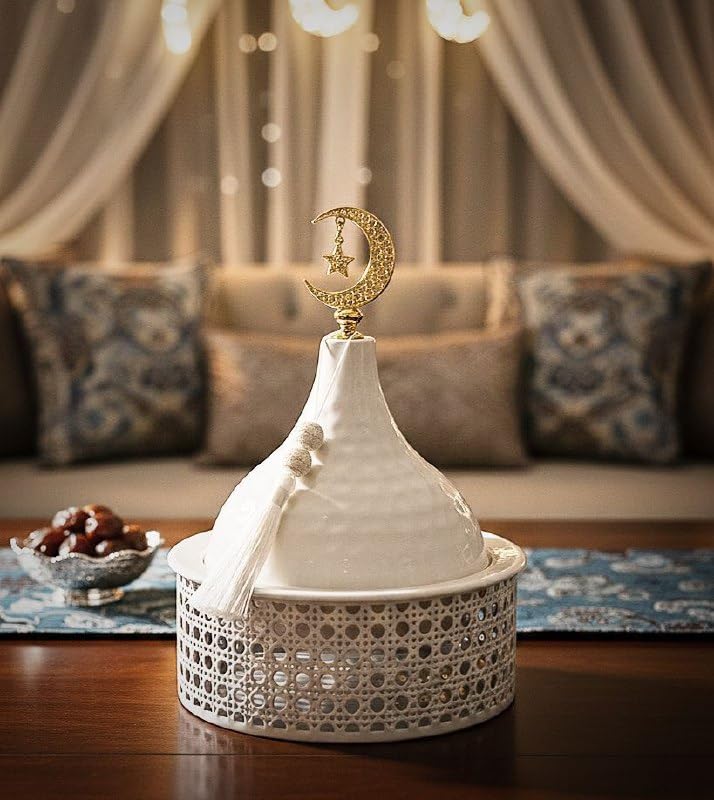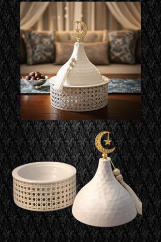 - تصميم إسلامي أنيق: صندوق تقديم فاخر بغطاء أبيض على شكل قبة مزين بهلال ونجمة ذهبي اللون في الأعلى، مثالي للديكور الرمضاني والمناسبات الإسلامية