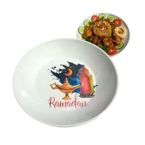 - تصميم رمضاني مميز: طبق بلاستيك أبيض يتميز بطبعات رمضانية ملونة وجذابة تضفي أجواء احتفالية على مائدتك خلال شهر المبارك