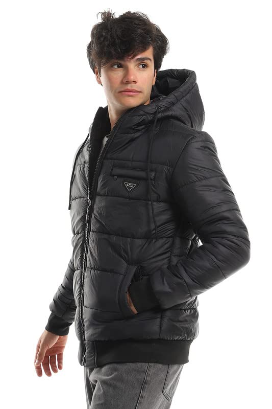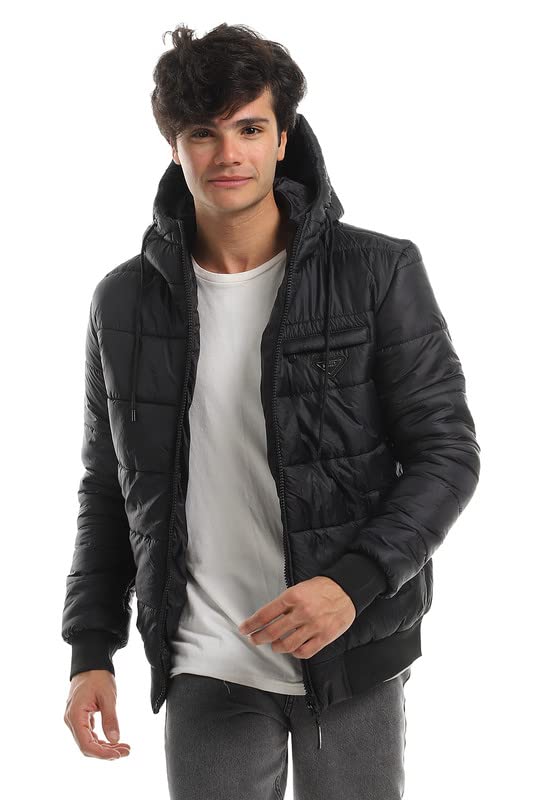 White Rabbit - وايت رابيت جاكيت منفوخ مبطن بغطاء للراس واساور اكمام وحاشية مضلعة للرجال، مقاس XL، لون اسود