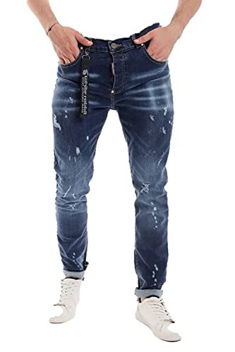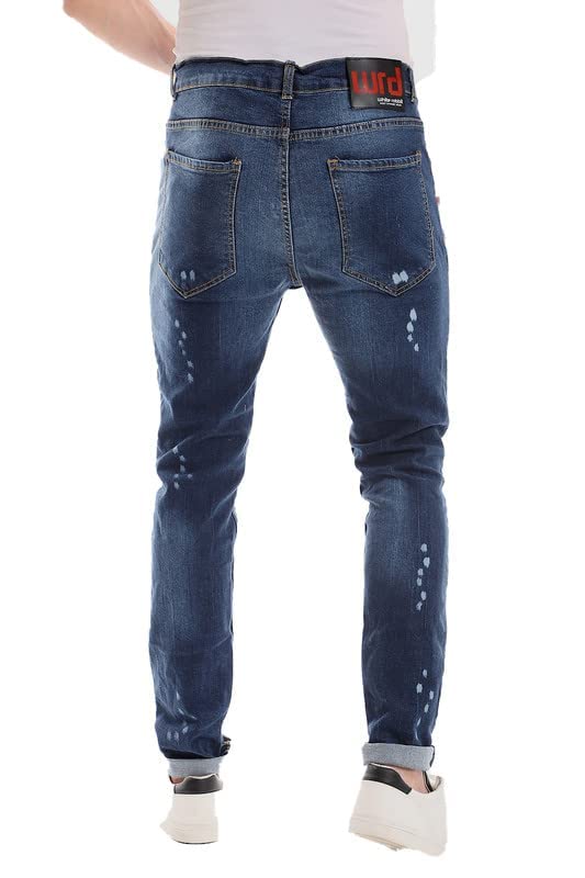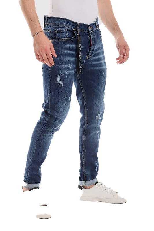 White Rabbit - بنطلون جينز رجالي بقصة ضيقة بتصميم مشبح ومقطع مزود بحلقات للحزام، ابيض, كحلي, 32