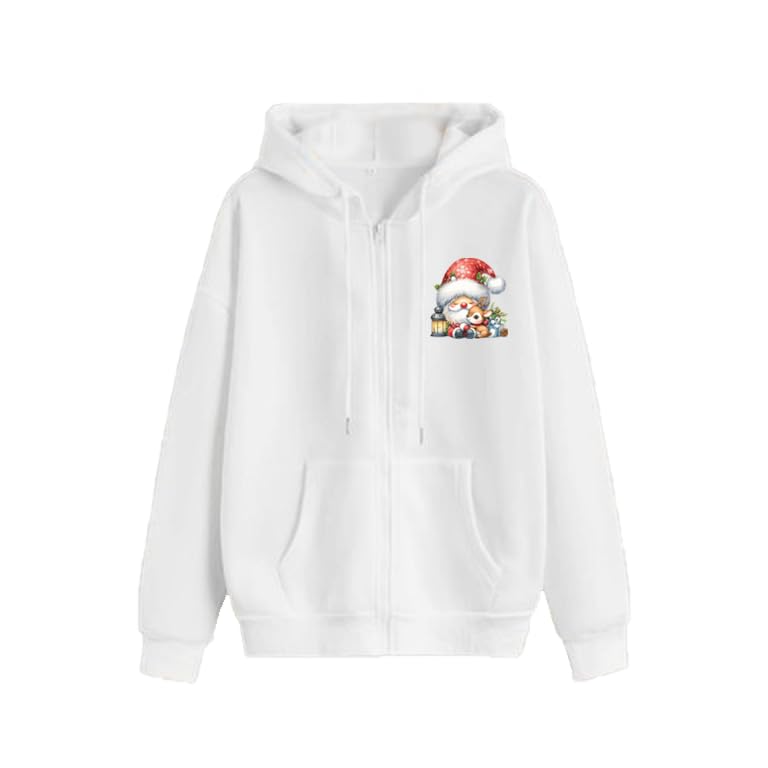 Generic - هودي ابيض بسحاب مع طباعة رجل ثلج للكريسماس، جيوب امامية، غطاء راس برباط (M)