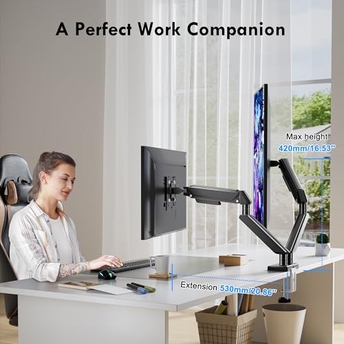 - 【حامل مكتب بذراع شاشة مرن】حامل الشاشة هذا مزود بآلية زنبركية تعمل بالغاز بحيث يمكنك ضبط الشاشات بشكل مستقل. يمكن وضع أذرع الشاشة على ارتفاع يصل إلى 420 ملم فوق سطح المكتب إلى مستوى العين. ويمكن للأذرع المرنة تمديد الشاشات 520 ملم بالقرب منك لتجربة مشاهدة أكثر غامرة.