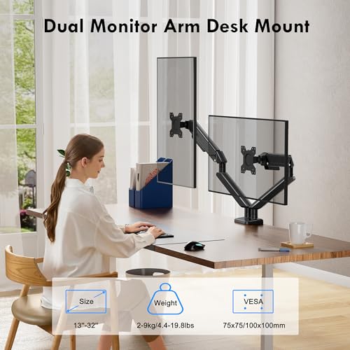 WHYFONE - حامل مكتب بذراع شاشة مزدوج من واي فون لشاشات LED LCD مقاس 13-32 بوصة، حامل ذراع شاشة قابل للتعديل بارتفاع قابل للتعديل، حامل بمشبك لسطح المكتب مع إمالة دوارة وزن 2-9 كجم، فيسا 75/100 ملم