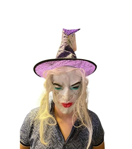 Generic - قناع الساحرة الشريرة مع شعر مستعار أبيض وقبعة ساحرة، لون أرجواني