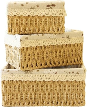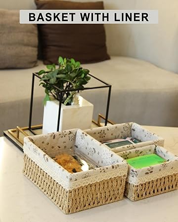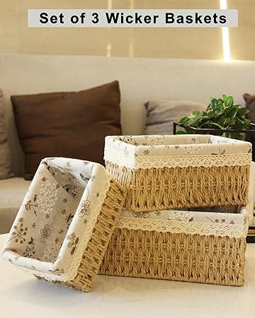 Generic - مجموعة سلال تخزين مكونة من 3 سلال من الخوص مع بطانة قابلة للازالة لتنظيم سلال التخزين للارفف، سلة منسوجة للديكور، سلة مستطيلة الشكل (سلة ويكر)