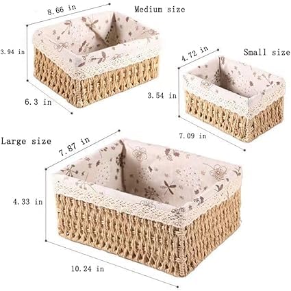 - 3 مجموعات من السلال المنسوجة الحجم: سلة صغيرة 7.1 × 4.7 × 3.1 انش؛ سلة متوسطة 8.8 × 6.7 × 4.3 انش؛ سلة كبيرة 10.2 × 8.2 × 4.9 انش. الوزن الإجمالي: 2.5 باوند. 3 سلال أرفف بأحجام مختلفة تلبي طلبات التنظيم المختلفة.