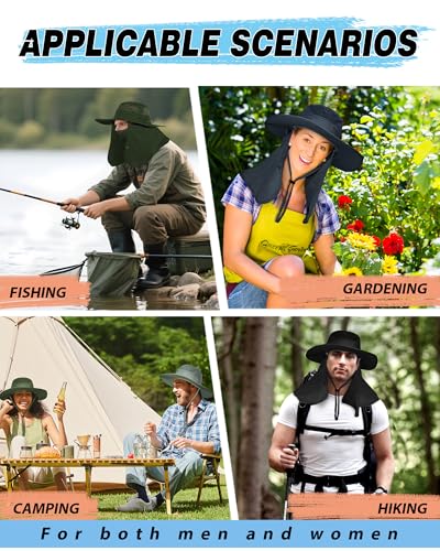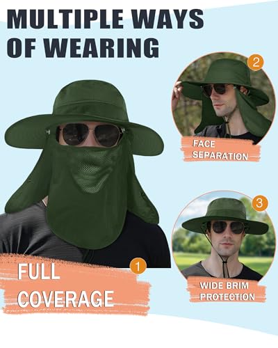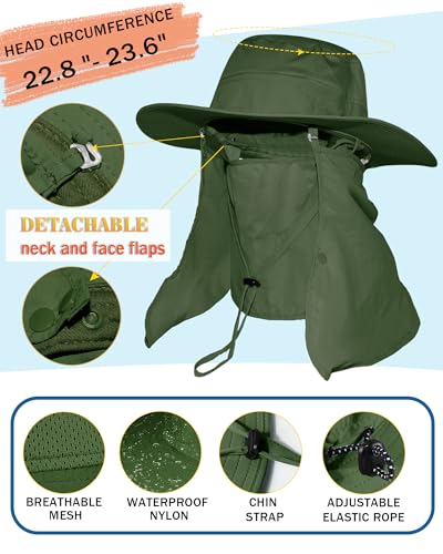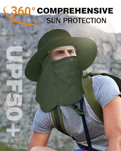 SHINCHIC - كاب شمس بحواف عريضة مع غطاء للوجه والرقبة قابل للفصل، كاب للسفاري والصيد مقاوم للماء للرجال والنساء بحماية من الأشعة فوق البنفسجية +50