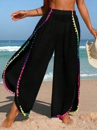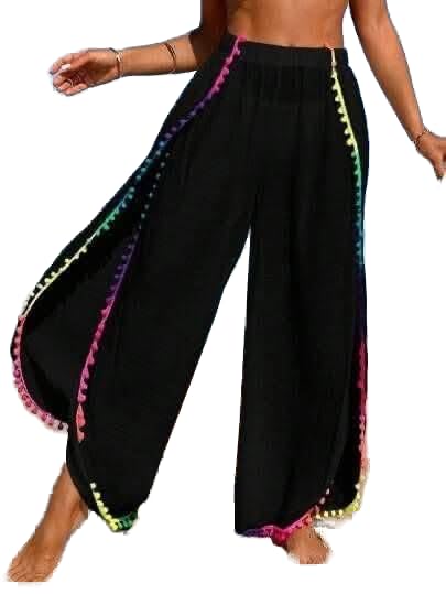 Generic - بنطلون شاطئ واسع الأرجل، أسود مع شراشيب قوس قزح، بفتحات جانبية
