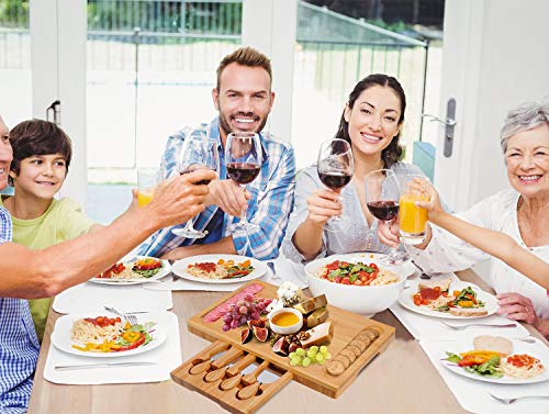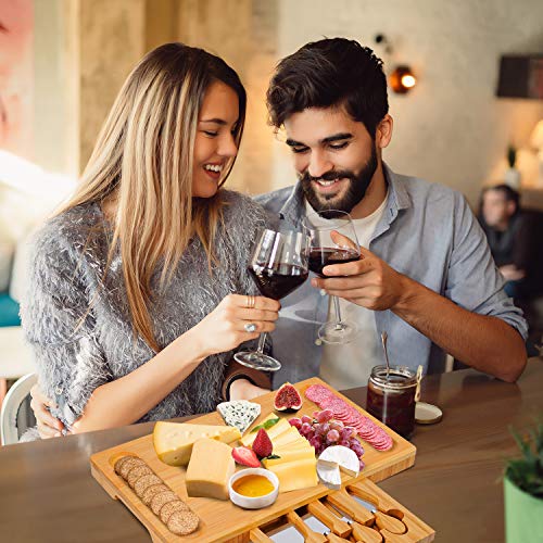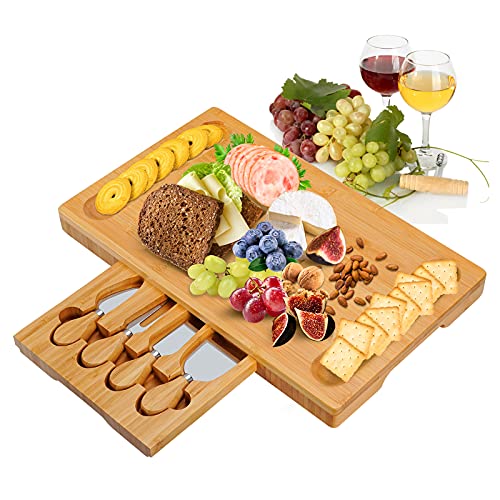 Widousy - مجموعة لوح جبن الخيزران صينية الجبن تشاركوتري وطبق تقديم اللحم مع 4 سكاكين من الفولاذ المقاوم للصدأ مثالية لهدايا الزفاف وحفلات عيد الميلاد بامبو
