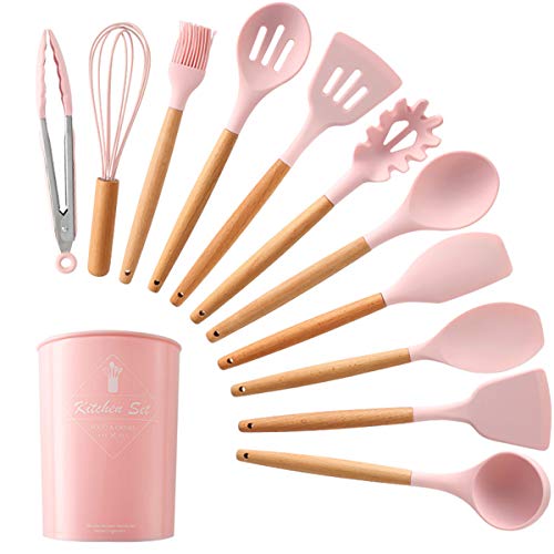 WINCOOK - مجموعة أدوات طبخ غير لاصقة من السيليكون من وينكوك، ملعقة سباتولا بمقبض خشبي، للمطبخ والمخبوزات، 12 قطعة
