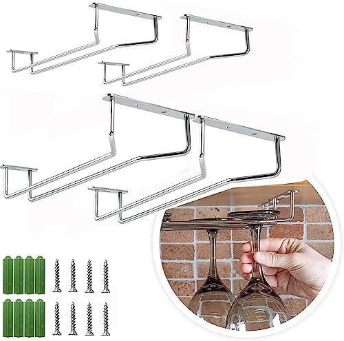 SYZJGCCR - رف كؤوس النبيذ، حامل اكواب تحت الخزانة من الستانلس ستيل - حامل ادوات مائدة معلقة لخزانة المطبخ والبار، مجموعة من قطعتين (فضي، 4 قطع، 10.6 انش)