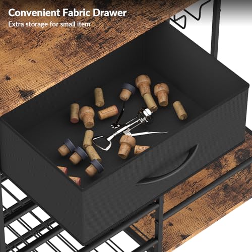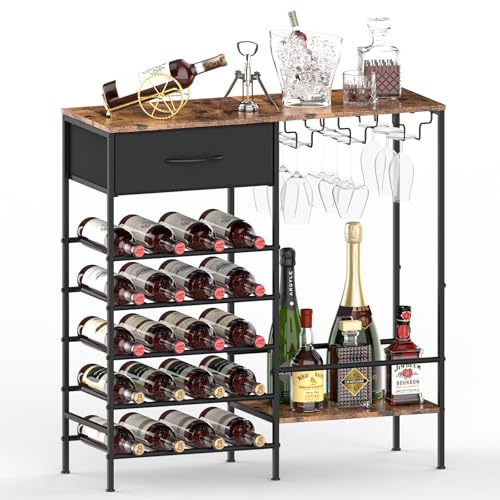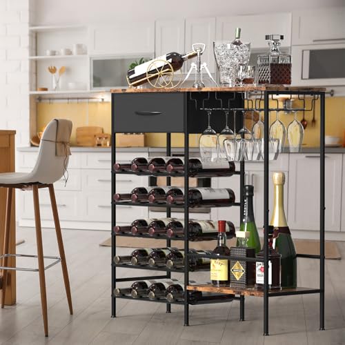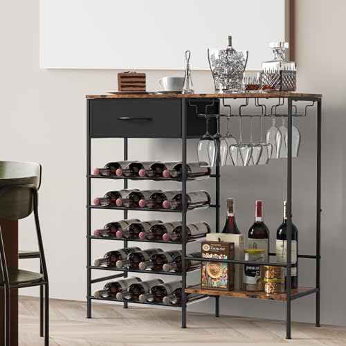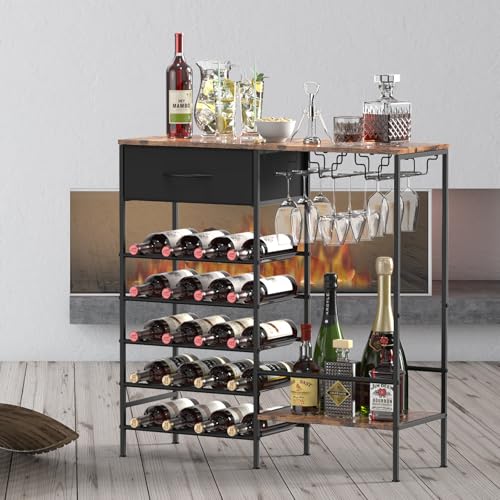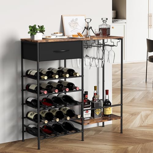 YBING - رفوف تخزين لعرض النبيذ، رف خشبي قائم بذاته، رف لخبز النبيذ من 5 طبقات مع حامل زجاجي وتخزين المشروبات، خزانة بار النبيذ الصناعية للبار والمطبخ وغرفة الطعام، بني ريفي
