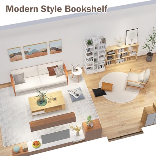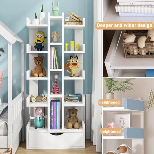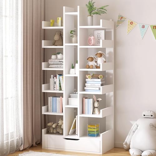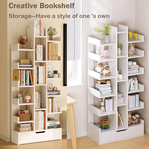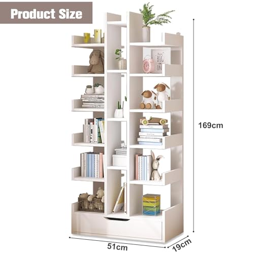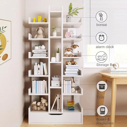 Winsoyya - رف كتب قائم أرضي على شكل شجرة من وينسويا، خزانة كتب عصرية من 18 رف مع درج، أرفف تخزين للعرض، خزانة كتب قائمة بذاتها، منظم كتب عملي لغرفة النوم وغرفة المعيشة والمكتب المنزلي (لون أبيض)