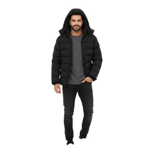 Generic - جاكيت شتوي مبطن منفوخ بغطاء للرأس، ملابس خارجية كاجوال للتدفئة، لون أسود