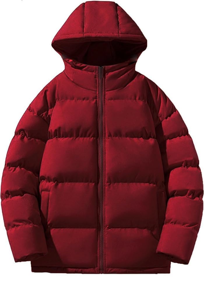 Generic - جاكيت شتوي منفوخ بغطاء للرأس، معطف مبطن بالزغب، احمر بورغندي