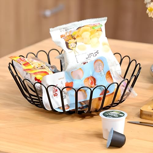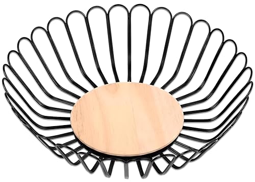 Generic - وعاء سلكي - سلة فواكه أنيقة تتميز بقاعدة خشبية متينة ، مثالية لتنظيم الفواكه والخضروات والوجبات الخفيفة والخبز في إعدادات المطبخ المعاصرة. (اسود)