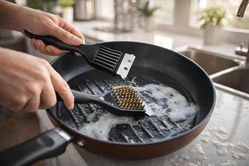 - تتميز مجموعة التنظيف ذات الوجهين هذه بفرشاة بشعيرات سلكية نحاسية متينة لإزالة البقايا العنيدة والمخبوزة وفرشاة نايلون ناعمة مصممة خصيصًا لتنظيف الأسطح غير اللاصقة دون خدش، مما يضمن احتفاظ أواني الطهي الخاصة بك بطبقة واقية بمرور الوقت.