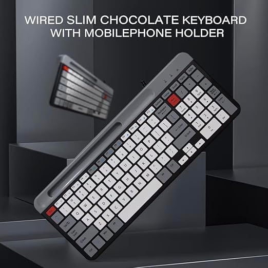 - حامل هاتف مدمج: تسمح لك فتحة حامل الهاتف المحمول المدمجة في الجزء العلوي من لوحة المفاتيح برؤية هاتفك الذكي بسهولة أثناء العمل، مما يحافظ على جهازك في متناول اليد