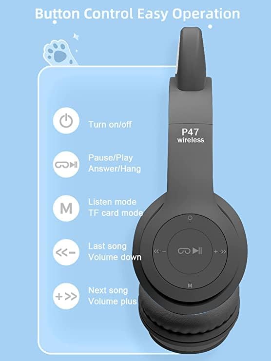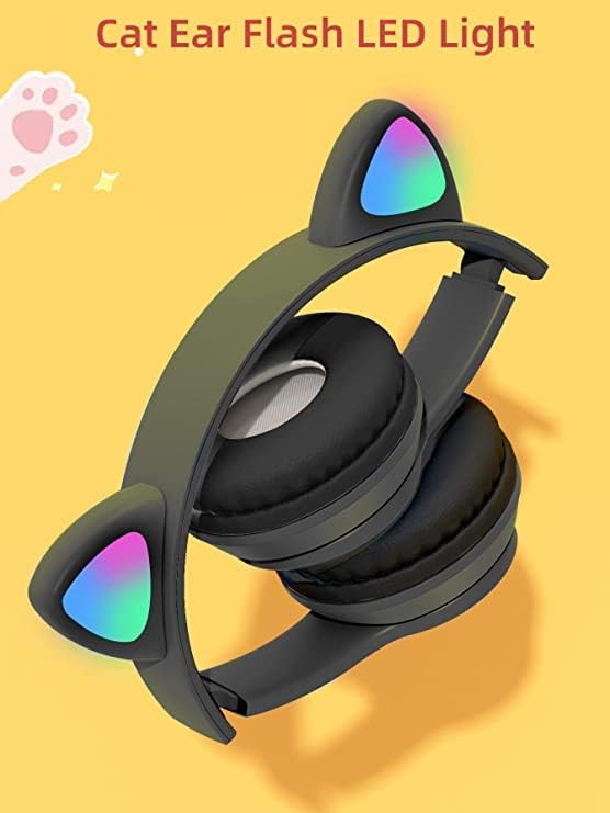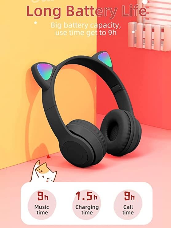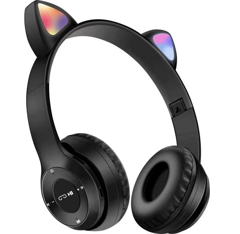 generic - سماعة رأس بلوتوث لاسلكية بميكروفون للاطفال والكبار (P47M (CAT, ستيريو تصميم اذن قطة باضاءة LED ومنفذ بطاقة TF قابلة للطي للبنات والاولاد (اسود) داخل الأذن
