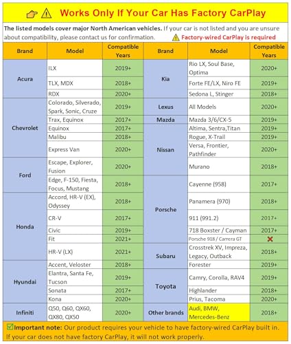 - [صغير للغاية ومتوافق عالميًا] أصغر من مفتاح السيارة، يخفي محول كاربلاي الخفي هذا في منفذ USB الخاص بك، مما يوفر المساحة. يتضمن مقابس USB A/USB-C لـ 99% من سيارات كاربلاي/اندرويد اوتو السلكية من المصنع (موديلات 2016 فما فوق). محول كاربلاي عالمي يعمل مع أكثر من 1000 موديل سيارة - لا حاجة لمصطلحات خاصة بالعلامة التجارية! أضف الحرية اللاسلكية دون التضحية بمساحة حامل الأكواب الخاصة بك!