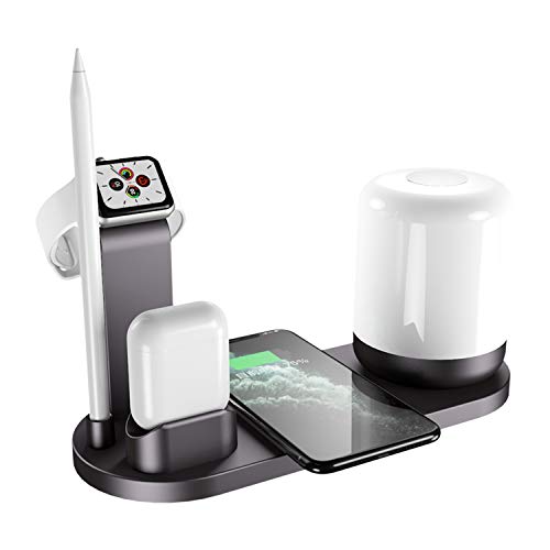 Q&F Tech - حامل شاحن لاسلكي مع مصباح ليلي WS6، محطة شحن لاسلكية معتمدة بمعيار الشحن السريع QI لسماعة ابل اير بودز/ساعة/قلم/سلسلة موبايلات ايفون وجالاكسي. تصميم ابداعي للعديد من الوظائف_اسود