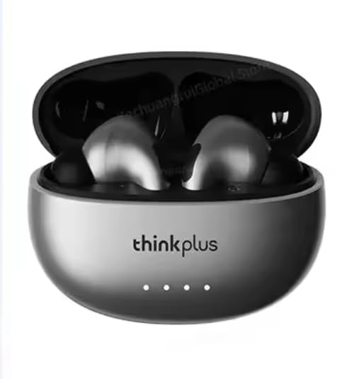 - سماعات لاسلكية: تصميم عصري مع علبة شحن أنيقة باللون الرمادي الداكن مع شعار ثينك بلس