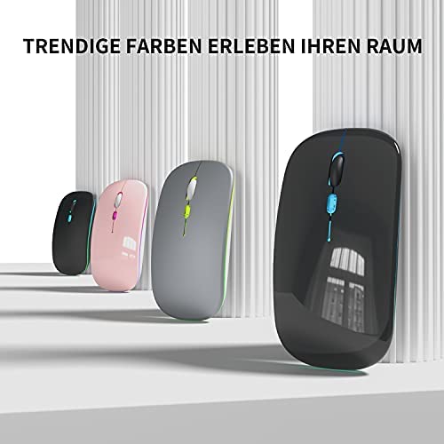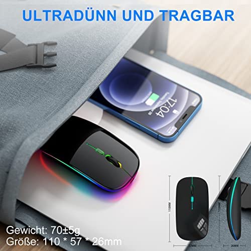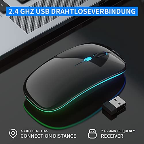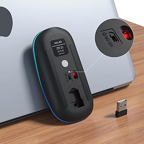 AAJO - ماوس لاسلكي قابل لإعادة الشحن للابتوب بإضاءة LED، ماوس لاسلكي رفيع مع 1600 نقطة لكل بوصة، ماوس صامت مع مستقبل USB، ماوس لاسلكي 2.4G للابتوب والكمبيوتر وماك والمكتب والعمل (أسود غير لامع)