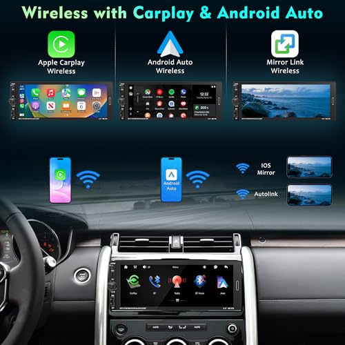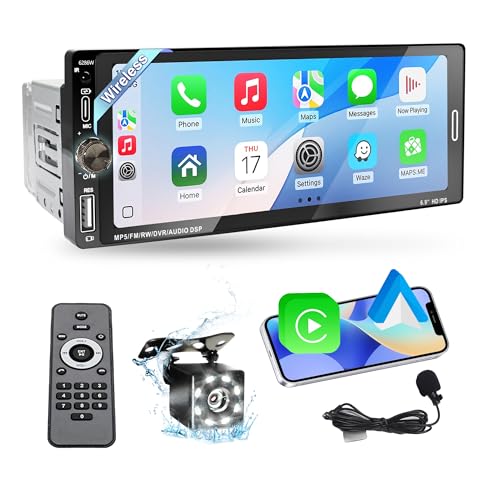Emeito - ستيريو سيارة لاسلكي بشاشة لمس 6.9 بوصة عالي الدقة HD بدرجة حماية من الماء مع آبل كاربلاي وأندرويد اوتو وميرور لينك واف ام ومعادل اي كيو، راديو أحادي DIN مع USB/نوع C وميكروفون وكاميرا احتياطية