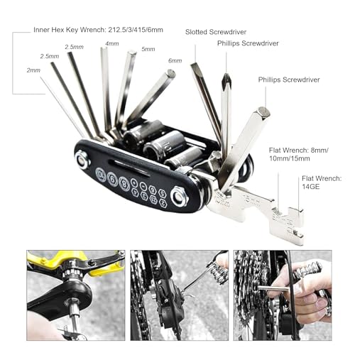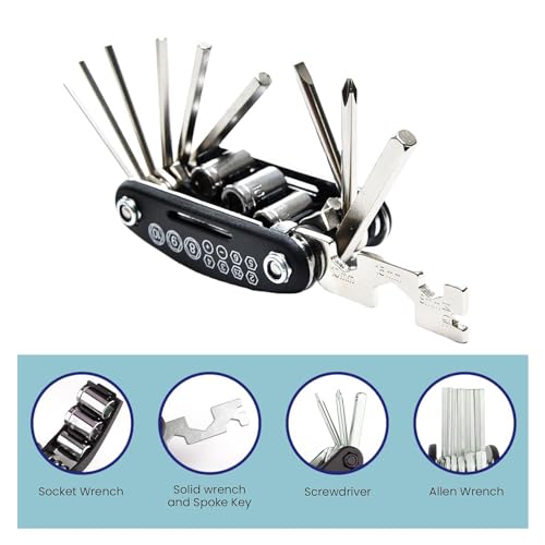 - 2. مجموعة إصلاح الدراجات متعددة الوظائف أثناء التنقل: تتضمن المجموعة مجموعة أدوات دراجة 16 في 1 مع أدوات مختلفة مثل رافعات الإطارات ورقع الإطارات والصمامات وأكثر من ذلك. مصنوعة من مواد عالية الجودة، صلبة ومتينة وعملية بالكامل وصغيرة الحجم وخفيفة الوزن