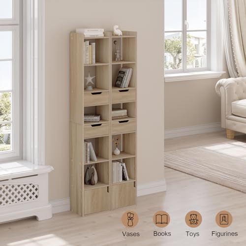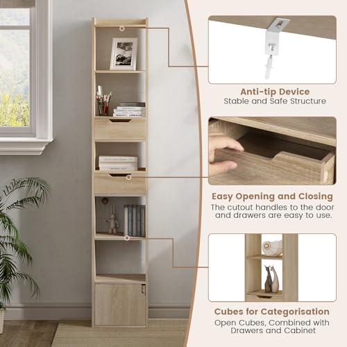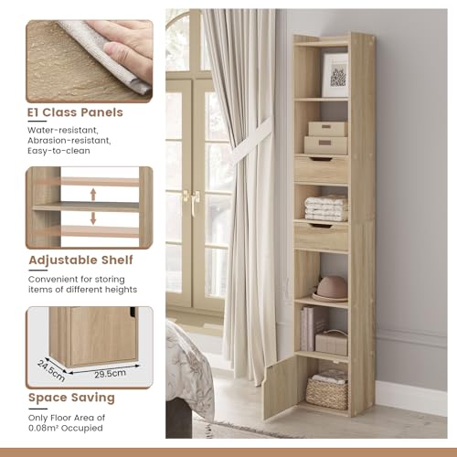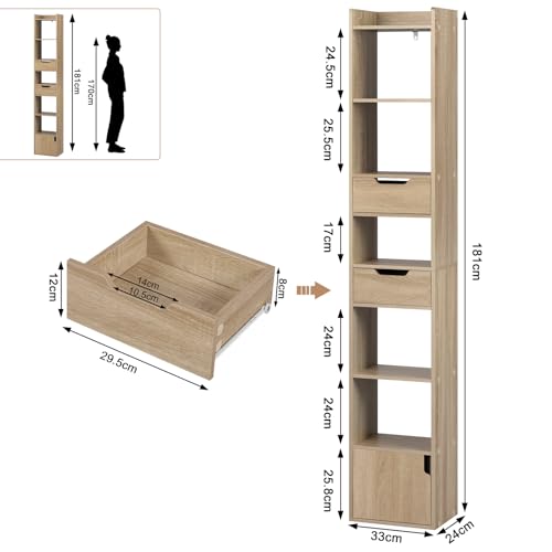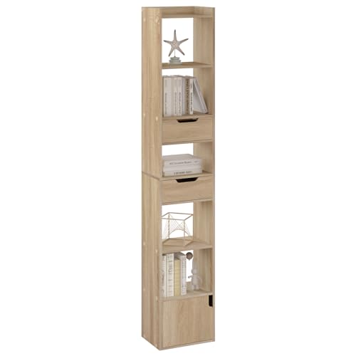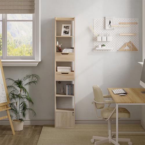 WOLTU - خزانة كتب عمودية قائمة بذاتها، رف موفر للمساحة، مكتبة كتب خشبية رفيعة وطويلة مع درجين و6 أرفف مفتوحة وضلفة واحدة مع باب، لون بلوط فاتح، موديل SK042hei من وولتو