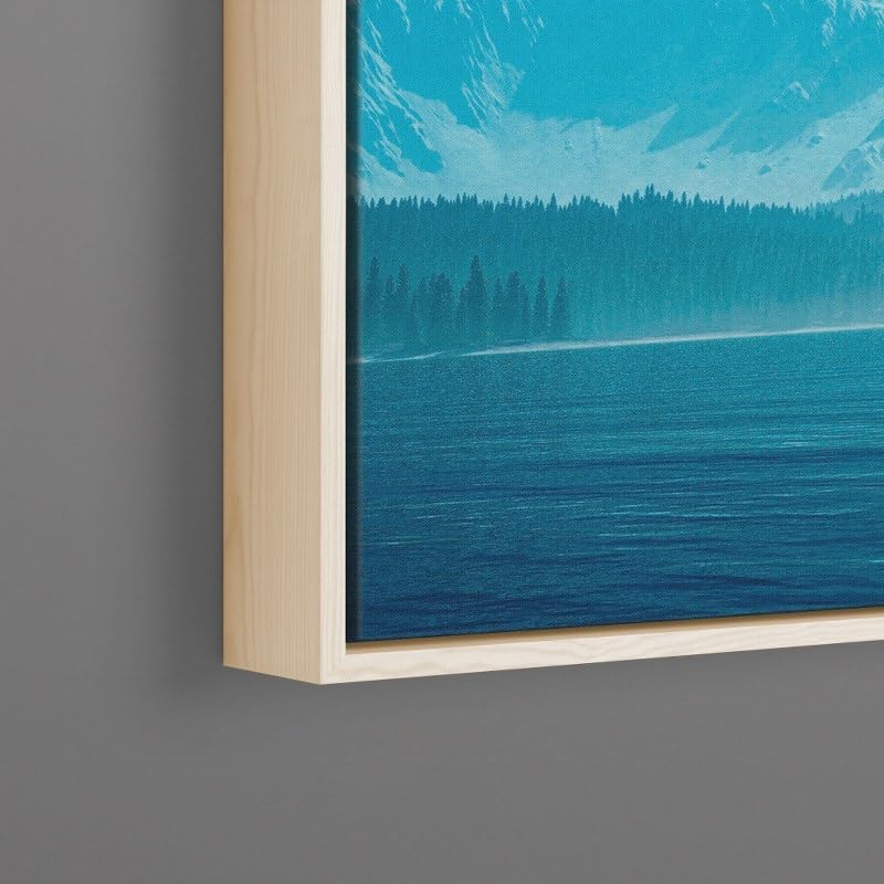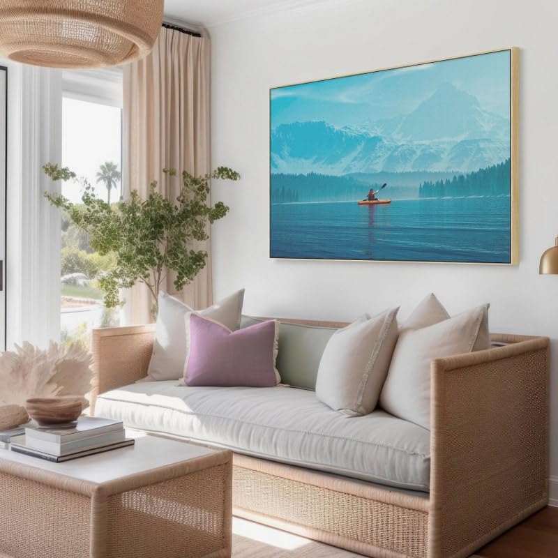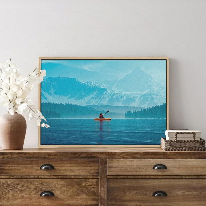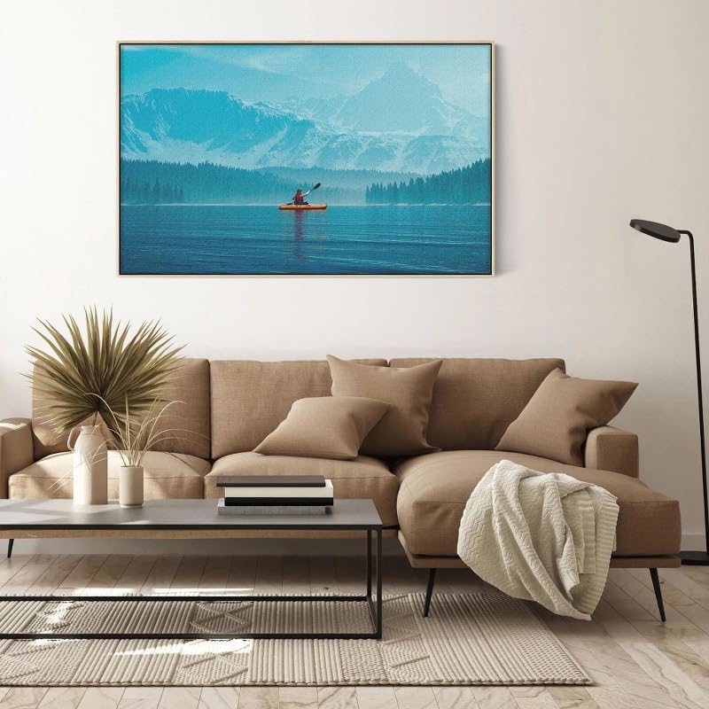 Home Gallery - لوحة فنية جدارية من القماش بطبعة امرأة تتجول في بحيرة بقارب ركوب الكاياك مع جبال، 90 × 60 سم