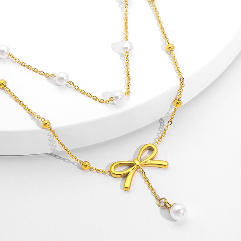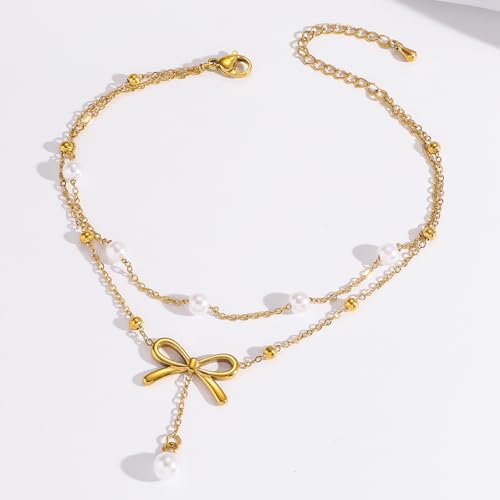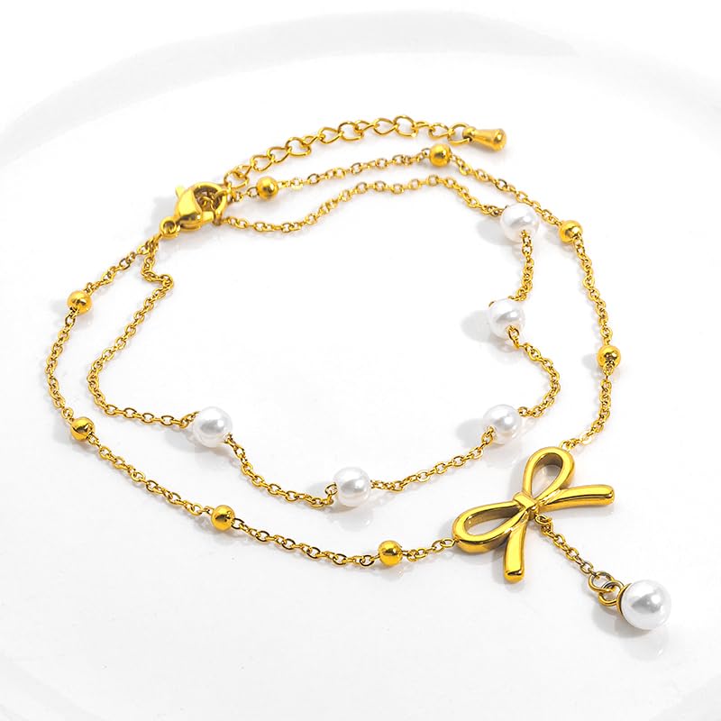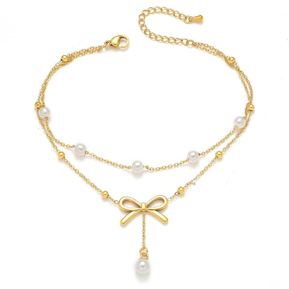 Generic - خلخال نسائي ذهبي مزين باللؤلؤ مع دلاية فيونكة أنيقة، خلخال مزدوج الطبقات مطلي بالذهب مقاوم للبهتان، تصميم أنثوي للصيف والشاطئ والمناسبات، لون ذهبي قابل للتعديل